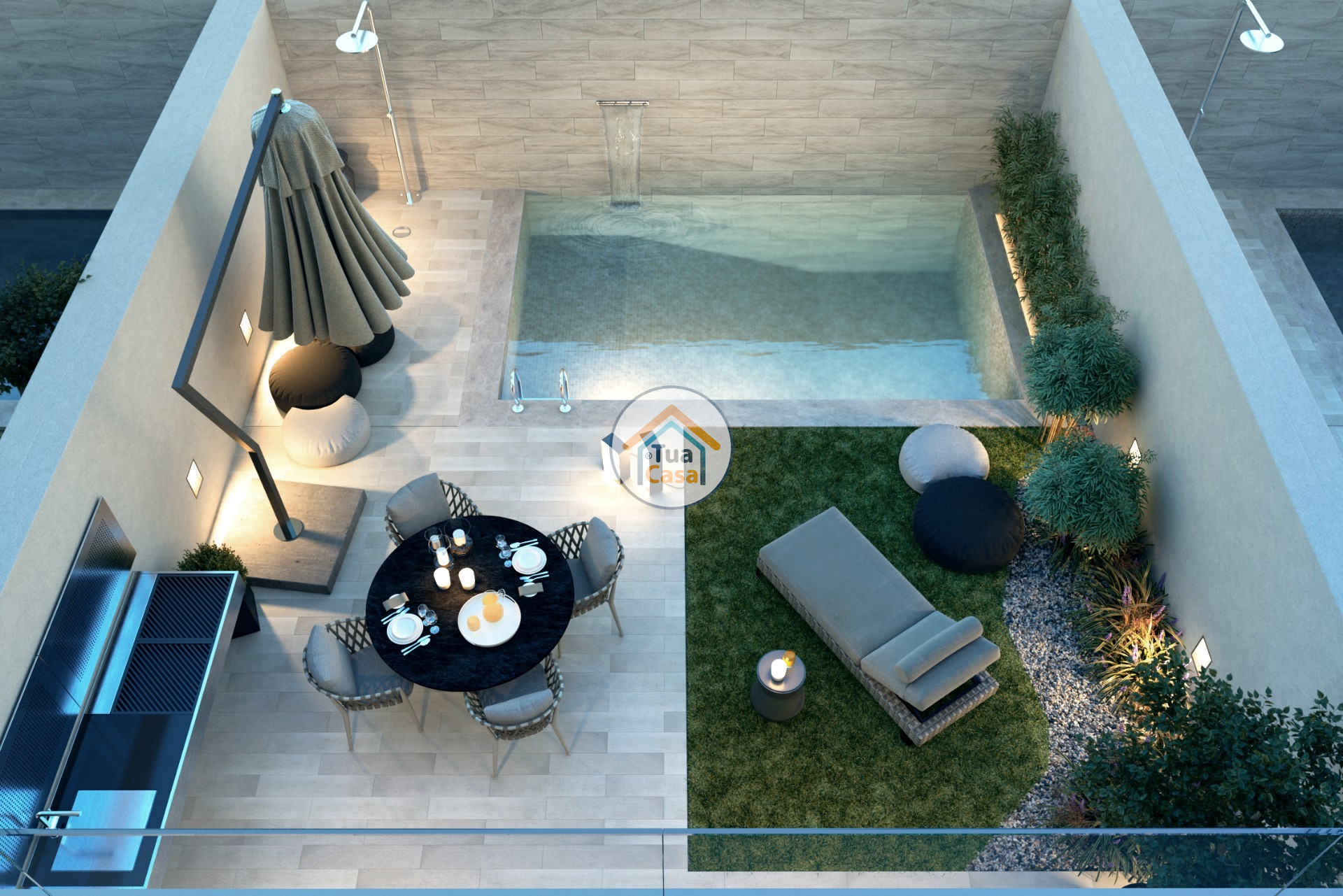 La cour a une pré installation pour le comptoir de barbecue avec piscine lave vaisselle avec cascade comme décoration.