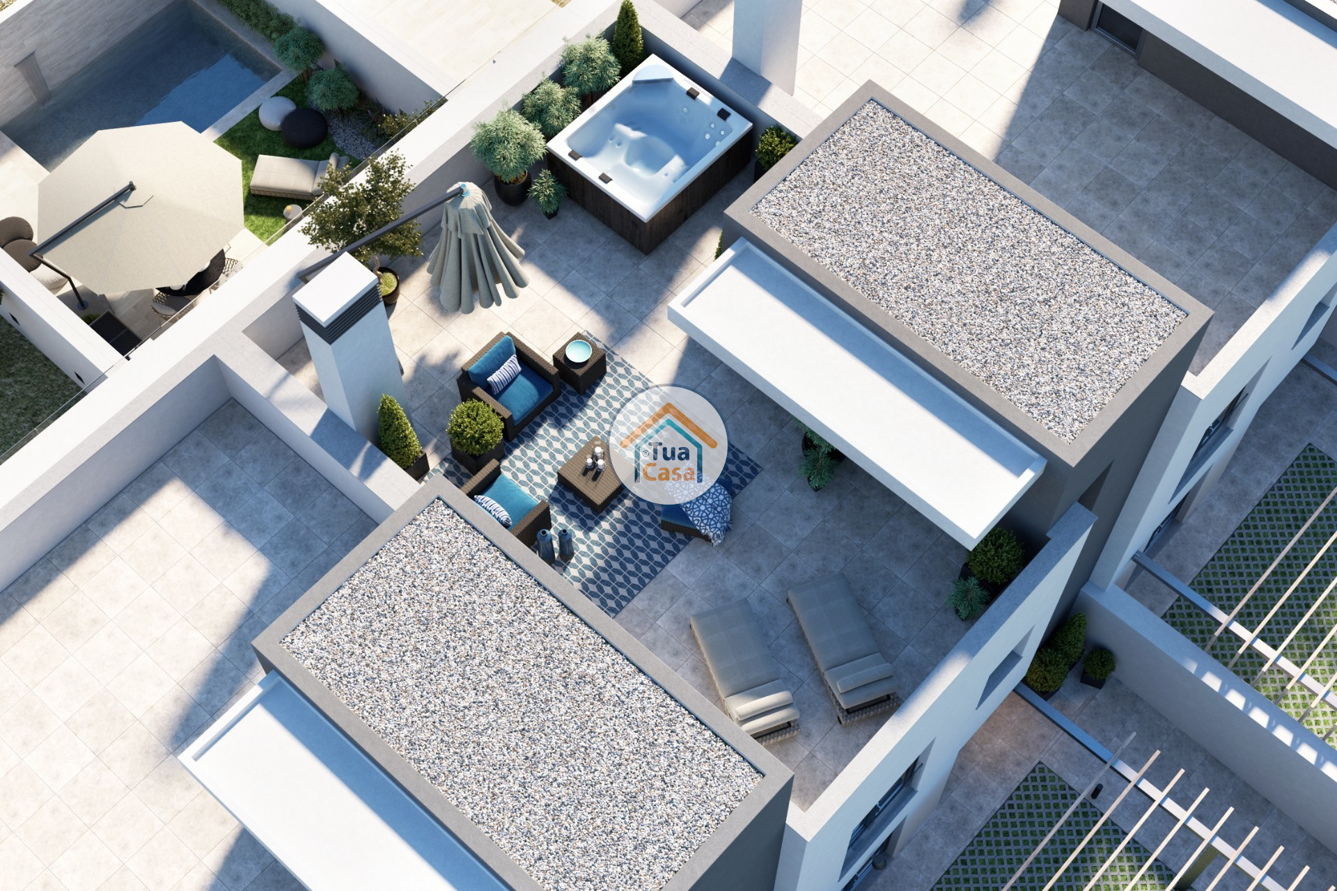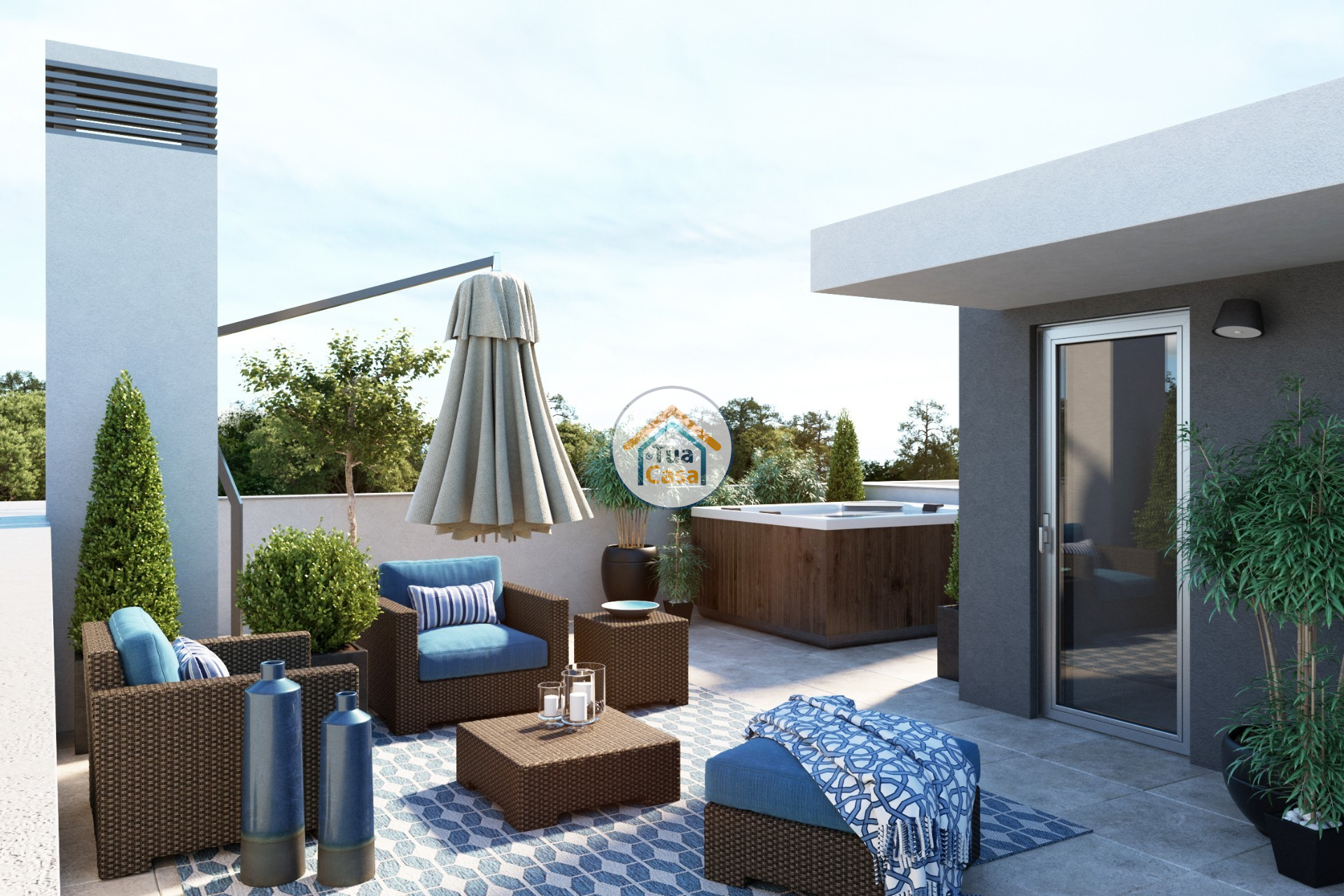 Au-dessus, nous avons une belle terrasse panoramique privée avec vue sur la Ria Formosa. Il a la possibilité d'installer un barbecue à côté d'un comptoir de cuisine, avec de l'eau et des eaux usées. a également une pré-installation pour un jacuzzi familial.